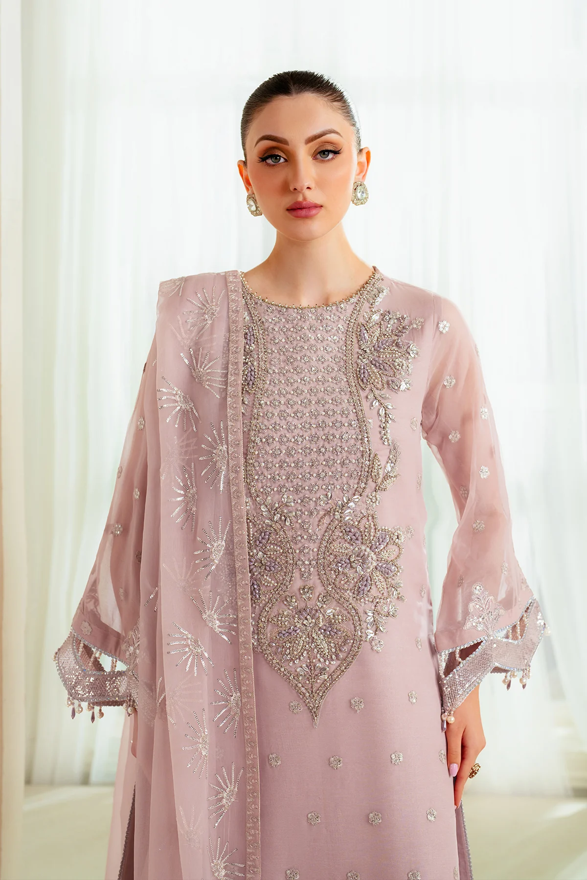 'Sira' effortlessly blends timeless charm with modern flair in a powder pink shirt. Adorned with heavy silver handwork and soft pink embroidery and shimmering border details. The masterful handwork on neckline and sleeves adds a touch of artistry. Paired with crushed raw silk trousers and a heavily embroidered chiffon dupatta, this ensemble radiates understated sophistication, making it the perfect choice for the wedding season.