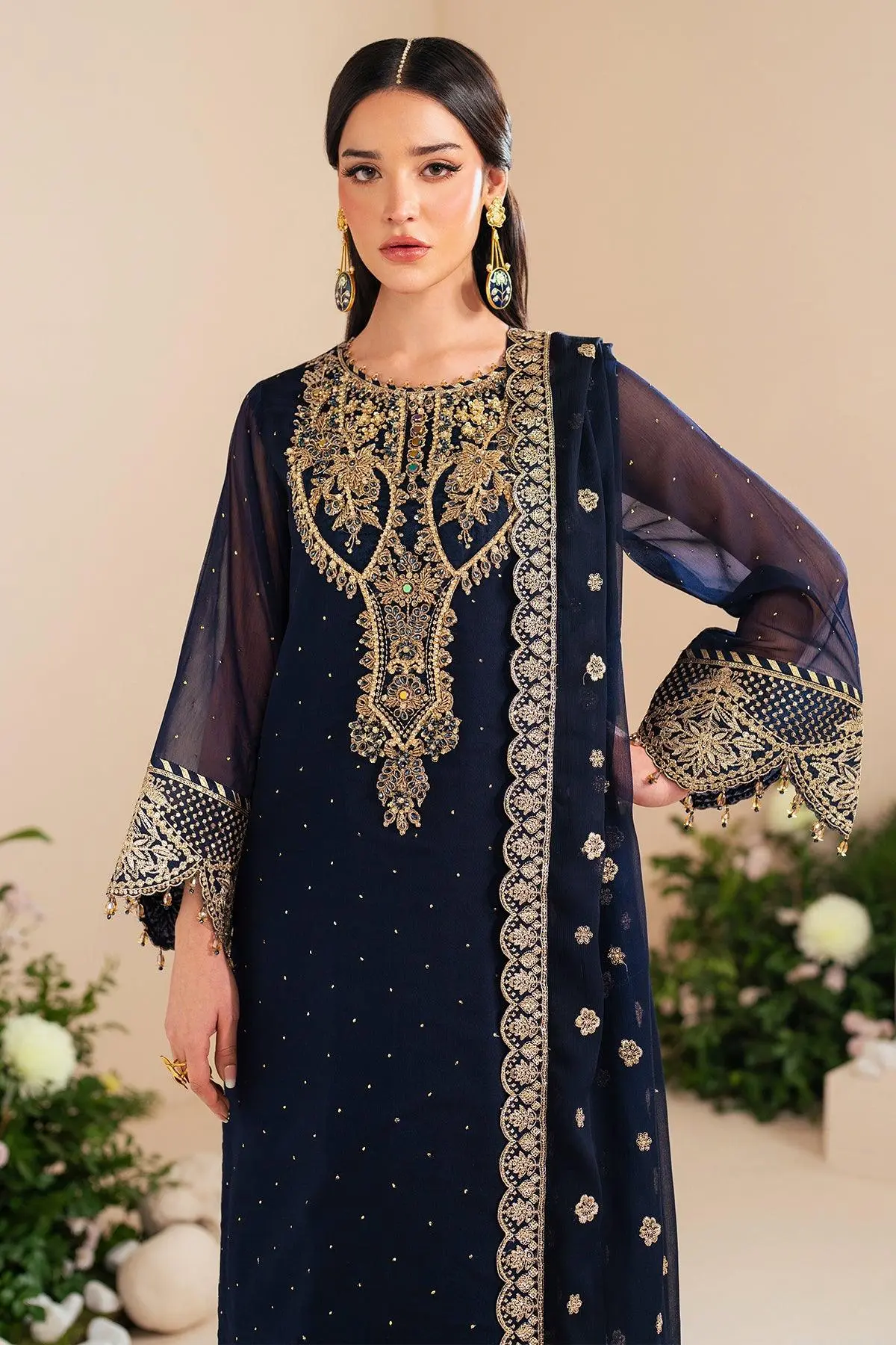"Erina" is a breathtaking ensemble crafted from deep blue muskaish chiffon. It features delicate hand embellishments, intricate embroidery, and shimmering light gold sequins. The look is beautifully complemented by Russian grip trousers with an embroidered border, perfectly balancing the richness of the chiffon dupatta. This exquisite outfit is an ideal choice for Eid celebrations.