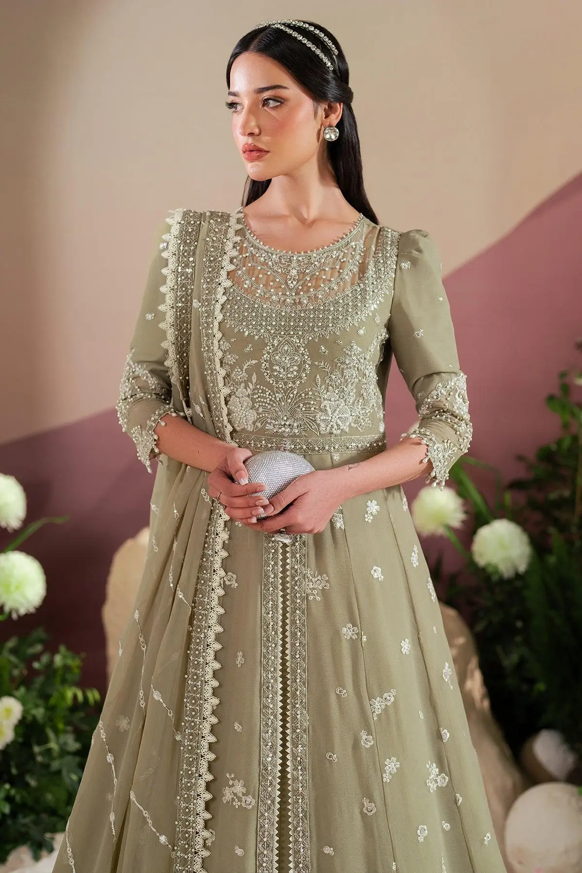 In a pleasant sage green, "Tunic" features stunning peal embroidery on a chiffon base, complemented by beautifully embroidered borders and sleeves. This combination exudes sophistication and elegance, paired with dyed raw silk trouser and a chiffon dupatta featuring with embroidered borders.