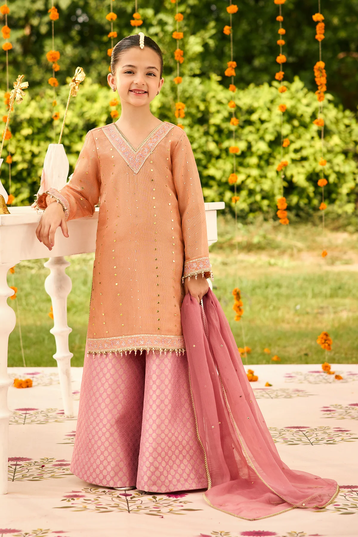 A beautiful peach shirt featuring shimmering Mukesh work on the Zari net fabric. The shirt has a detailed embroidered trim accenting the neck and sleeves. Paired with a stylish, textured Jamawar trouser for a comfortable, wide-leg look. Finished with a coordinating Bamber Chiffon dupatta.